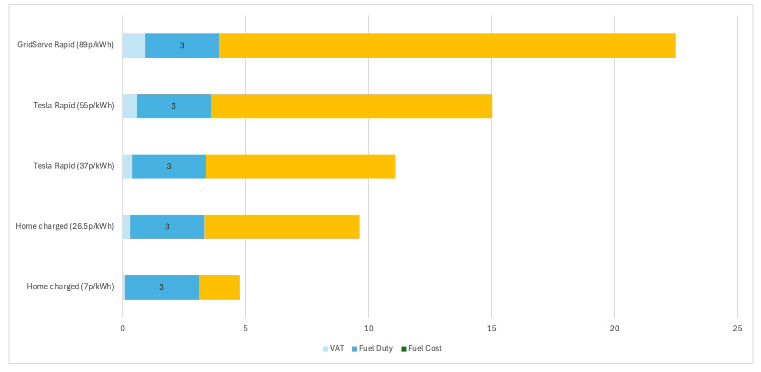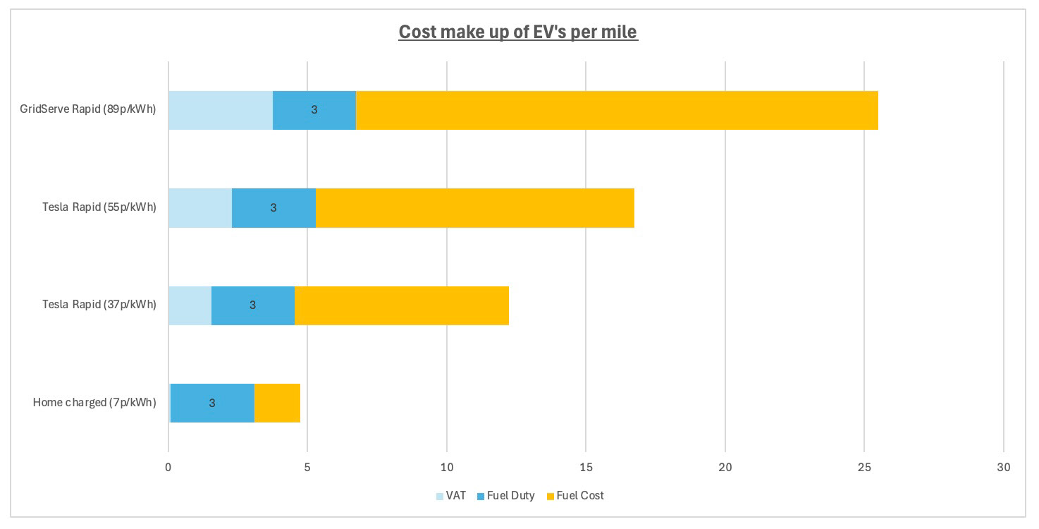 A cost per mile will increase the tax aspect paid by EV's from the cost per mile perspective. Tax paid by a home charged EV at 7p/kWh would increase from 0.08p to 3.08p per mile.