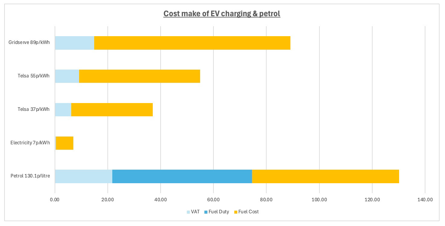 Home charging an EV via a specific EV tariff can be as low as 7p/kWh, whilst public charging can range from 37p/kWh to 89p/kWh. Whilst VAT take increases with the cost of a kWh, a home charged EV at 7p/kWh is taxed at just 0.08p whilst a tesla at 55p/kWh is taxed at 2.3p/kWh. At GridServe charger at 89p/kWh is taxed at 3.7p/kWh.