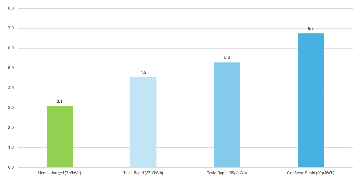 It would also help to reduce the cost per mile of expensive public charging too. GridServe at 89p/kWh would decrease from 25.5p/mile to 22.5p/mile if the VAT rate was dropped to 5%.