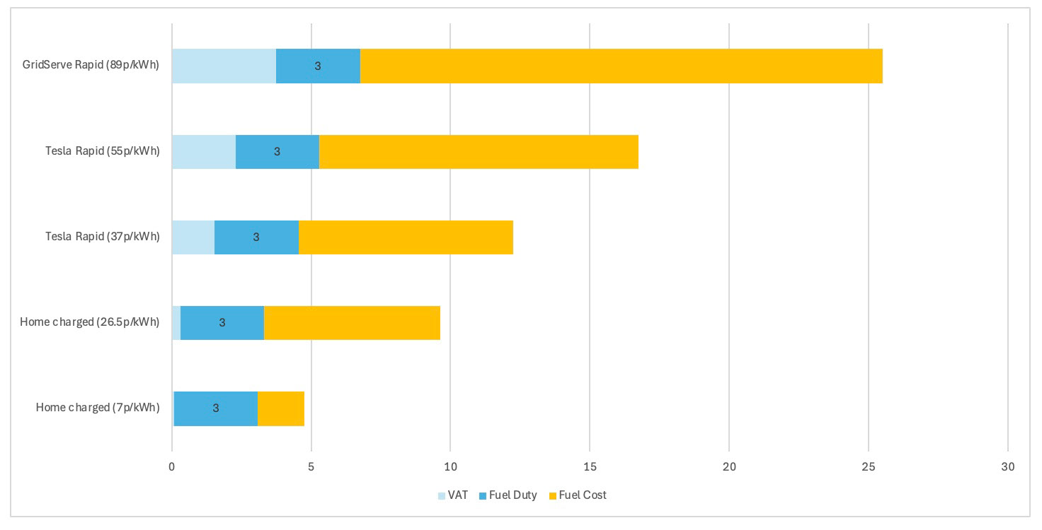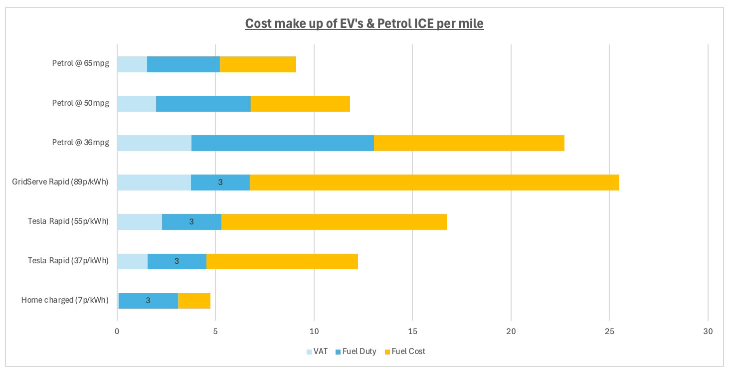 When we compare the cost per mile of petrol and EV's we can see that home charged EV's will still have the lowest cost per mile. An EV charged at 37p/kWh will have a similar cost per mile to that of a petrol car at 50 mpg. An EV charged using a GridServe charger at 89p/kWh will cost slightly more per mile to a petrol car at 36 mpg. What we can notice is that the tax paid by EV's will generally be lower than a petrol car.