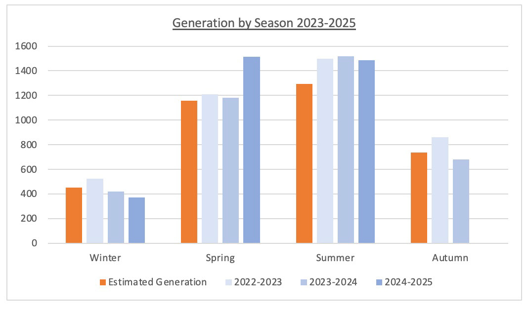 Summer 2025 saw a total generation of 1488kWh. This was actually the lowest summer generation in 3 years when compared to 1498kWh in 2023 and 1519kWh in 2024. Each of those years were all over the estimated summer generation of 1295kWh.