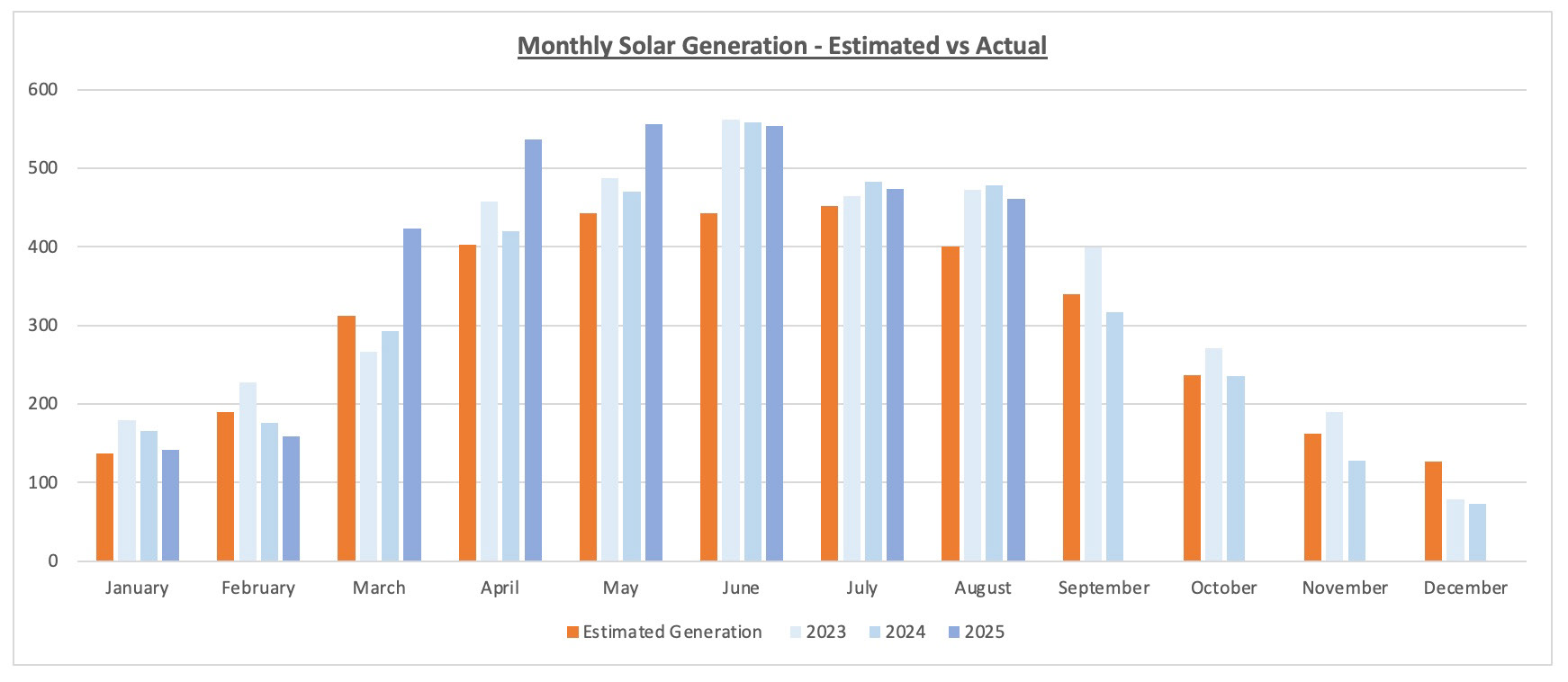 August's generation was slightly below July's generation with 460kWh. It was higher than the estimated generation of August (actual generation was 115% of the estimated 400kWh). Overall is was our lowest generation in August compared to previous years (478kWh in 2024 & 472kWh in 2023).