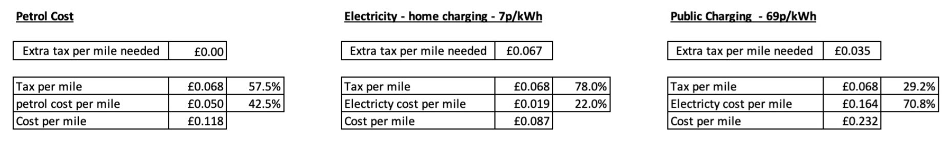 What is clear though, charging an EV at home using an EV tariff (7p/kWh rate) would be 25% cheaper than fuelling a petrol car (£1.30/litre) if the tax per mile was equalised at 6.8p per mile.