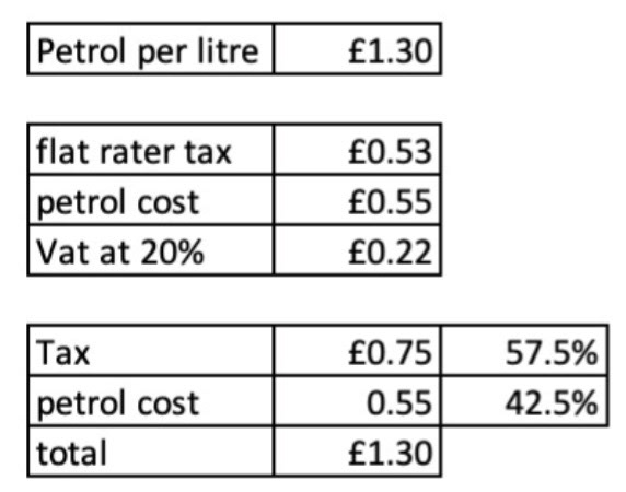 Fuel duty is currently levied at a flat rate of 52.95p per litre for both petrol and diesel, while VAT at 20% is then charged on both the product price and the duty. A litre of petrol at £1.30 per litre is 57% tax, or 75p of the £1.30 is tax.